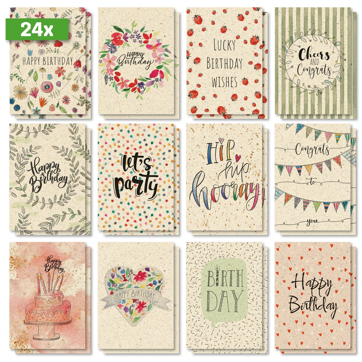 box contents: 1x Set of birthday cards DS705, 24 cards + envelopes, incl. white envelopes