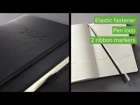 The cover has a rippled surface that is pleasant to the touch and makes the planner an elegant companion. Its practical information section and many useful features are bound to impress. For example, you will always have a pen on hand in the elastic pen loop, and the perforated note pages are ideal for jotting down and passing on notes. Organise your appointments and notes with the stylish stickers included. Top quality and superb design - you will simply love this bound planner.