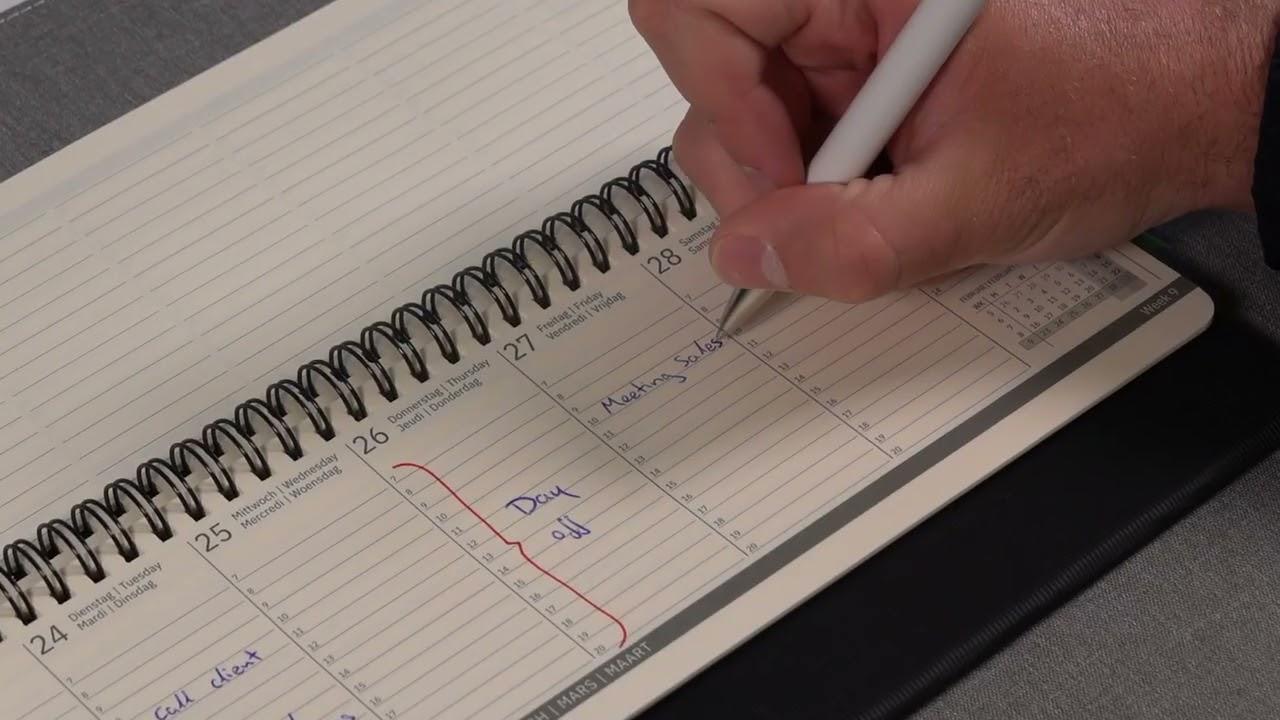 Avec sa couverture striée Softwave, le calendrier au style "business" est très agréable au toucher. Le papier de couleur chamois élégant fera le bonheur de vos yeux. Grâce à sa reliure par anneaux métalliques, le calendrier se pose à plat ou en position chevalet. Les pages d'infos supplémentaires pratiques font du calendrier de bureau votre assistant personnel. Organisez vos rendez-vous et vos notes avec les autocollants élégants inclus. Avec sa qualité et son design haut de gamme, ce calendrier a tout pour séduire.
